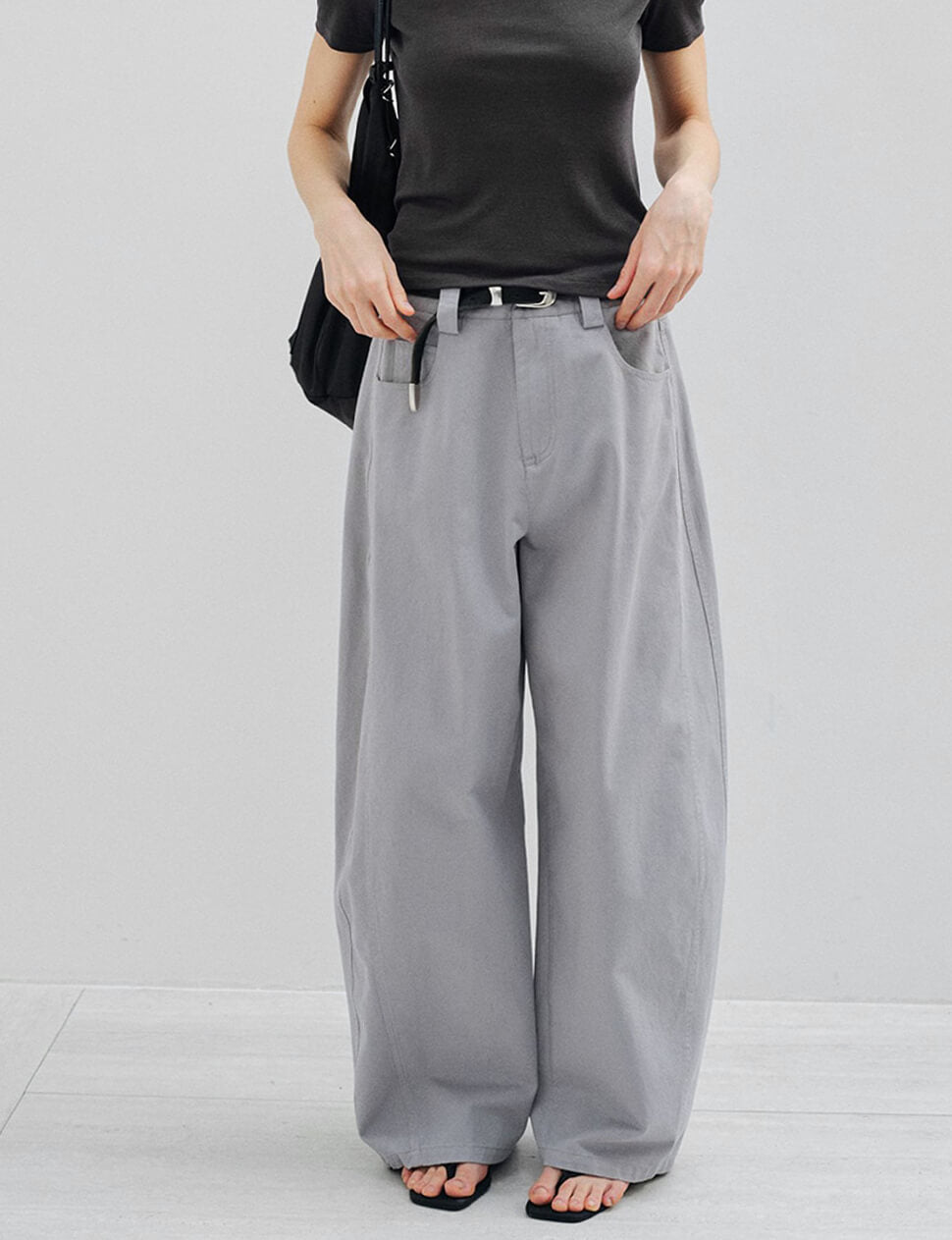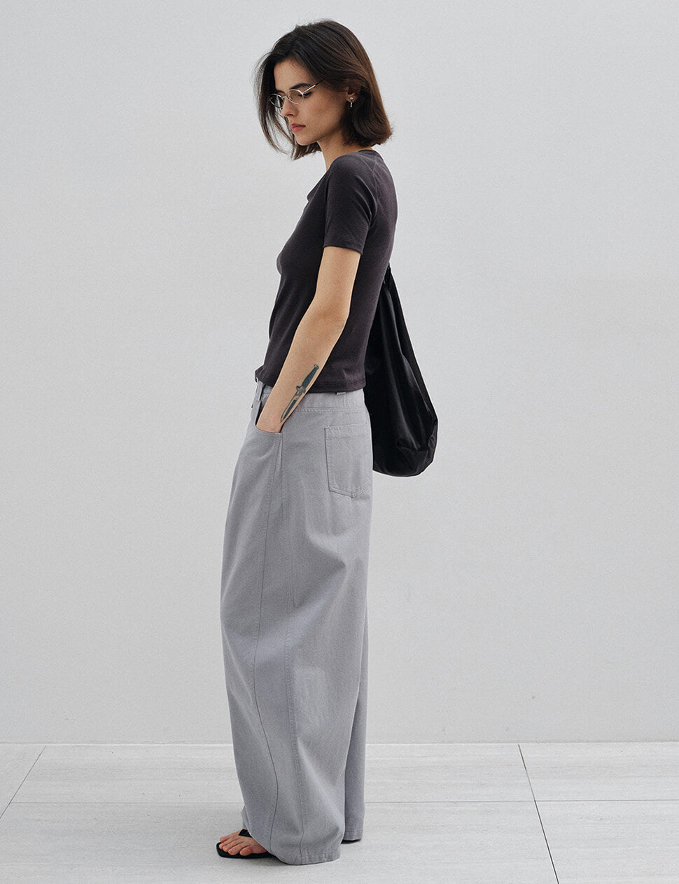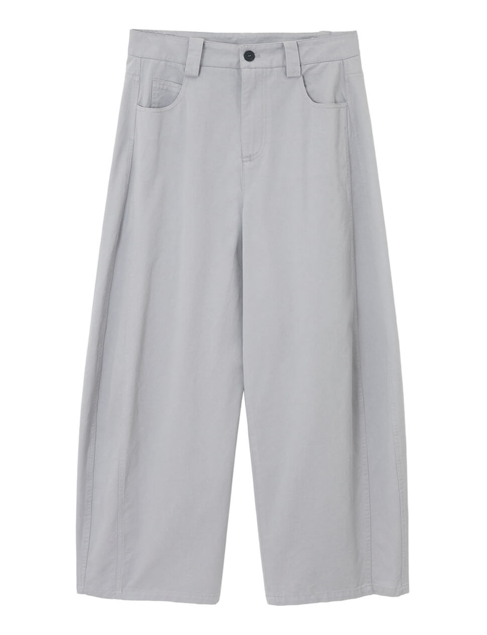 The trouser of the moment. These grey cotton barrel leg pants are cut in a wide, curved silhouette with a structured waist, five-pocket construction, and a single button closure. The curved seam through the leg does the visual work — everything else stays clean and simple.Wear them with a fitted tee and sandals or layer under an oversized shirt or bomber. The model wears a medium for a relaxed, easy fit.