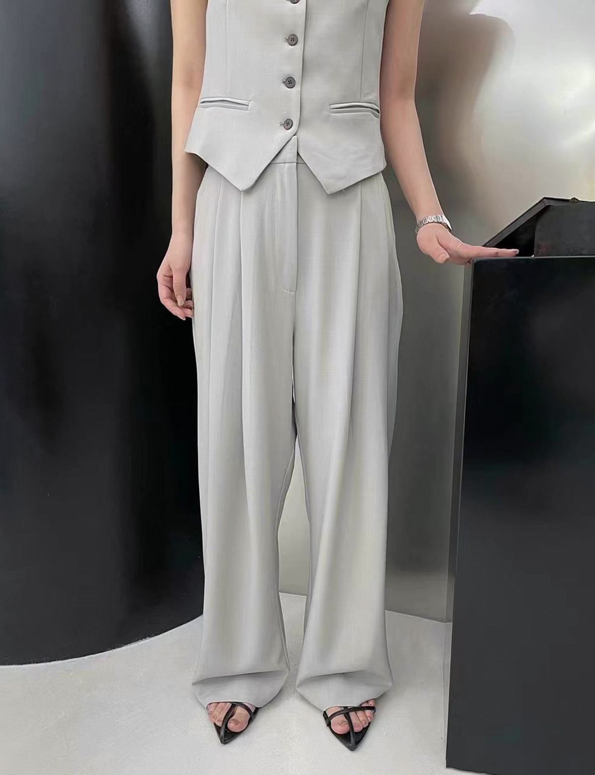 Relaxed soft grey tailored pleated pants . Styled with matching vest .