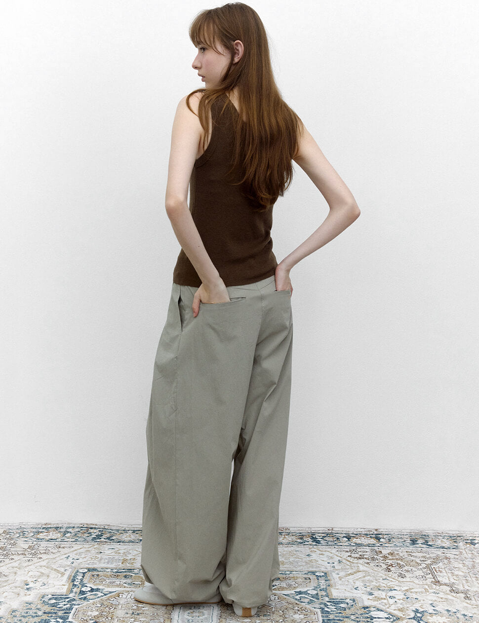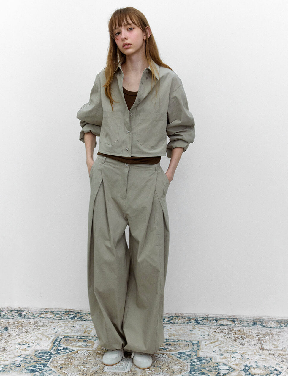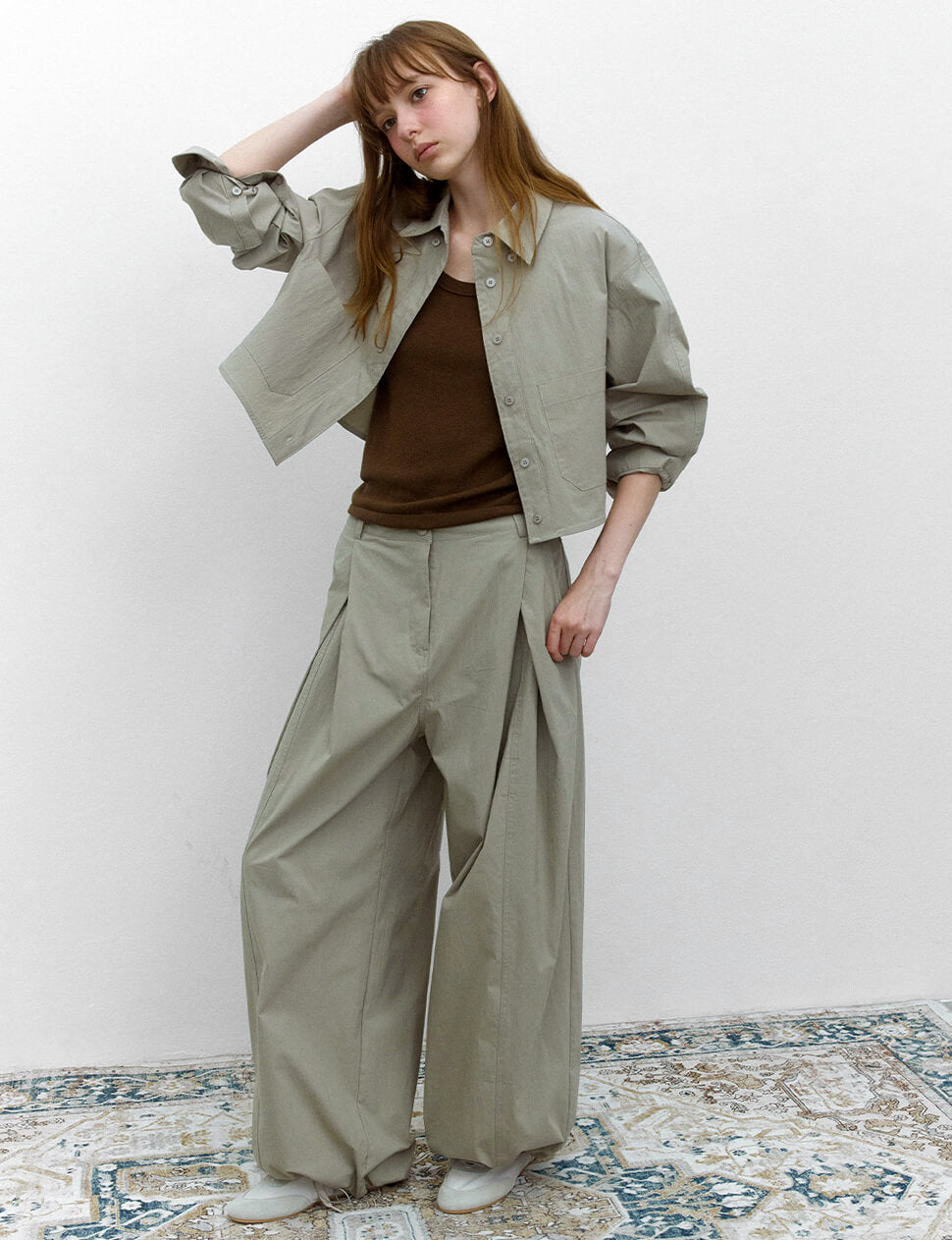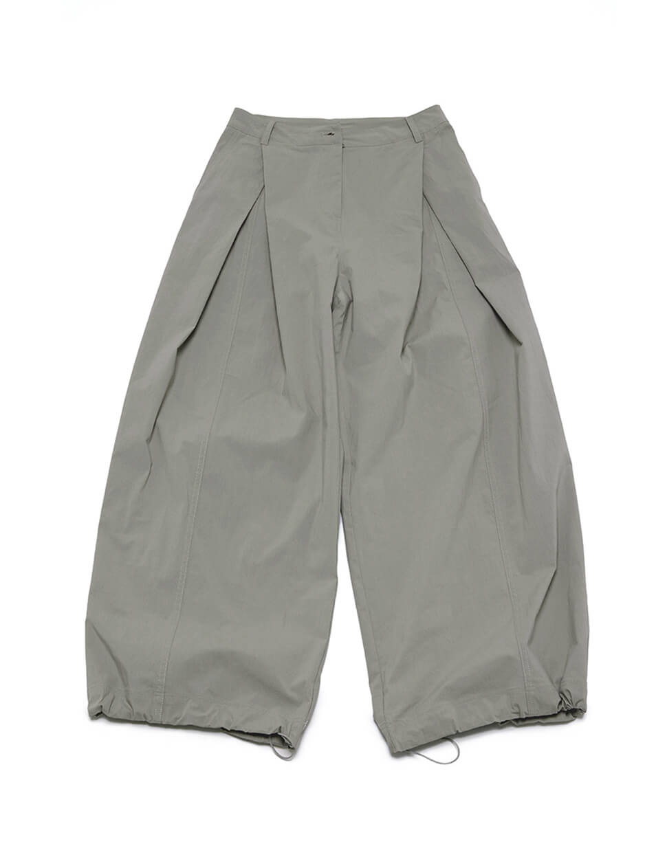 Grey pleated baggy pants with parachute gathered hem