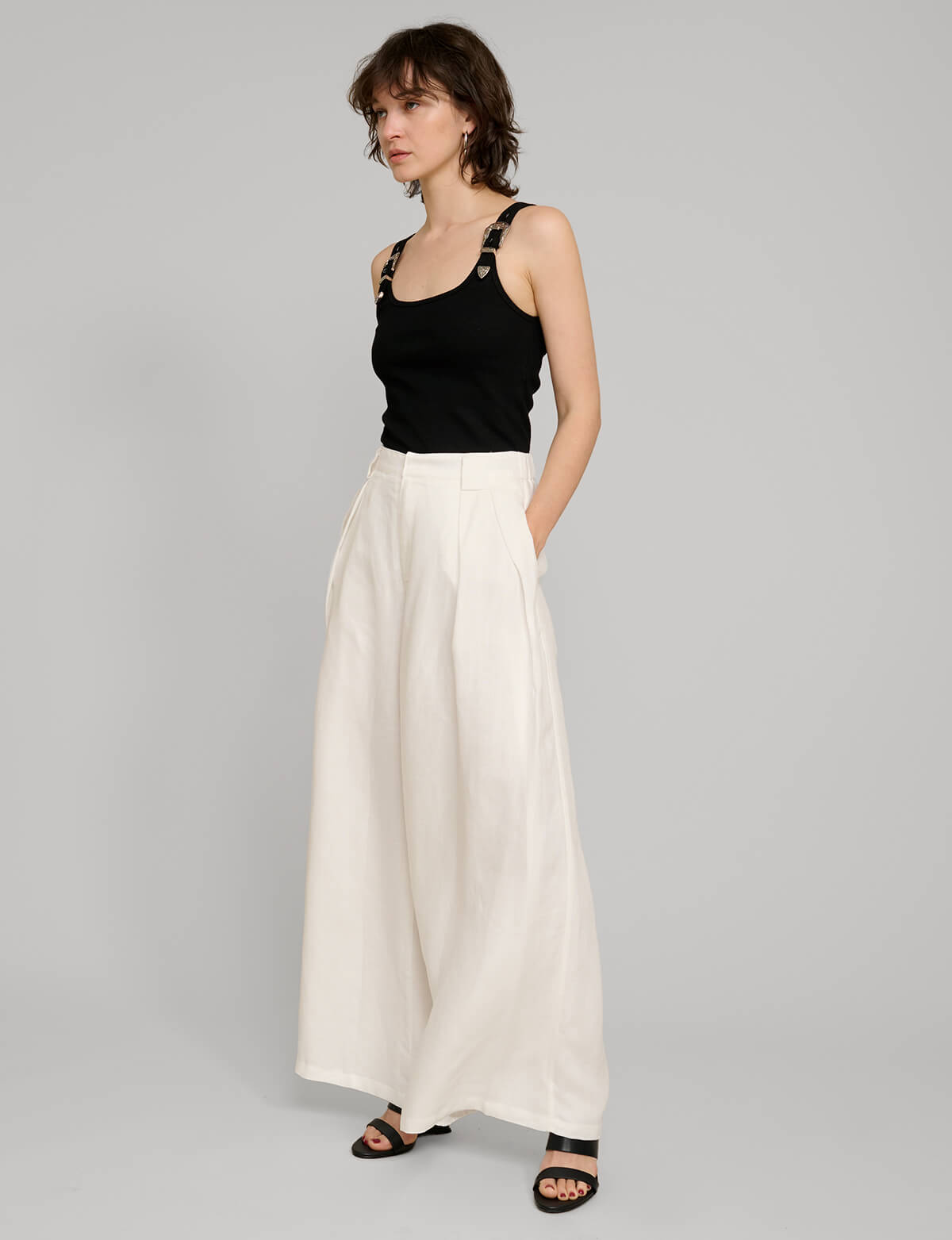 White linen wide leg pants . Styled with matching oversized vest .