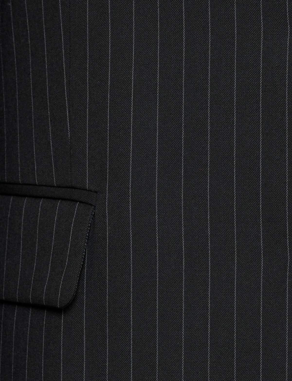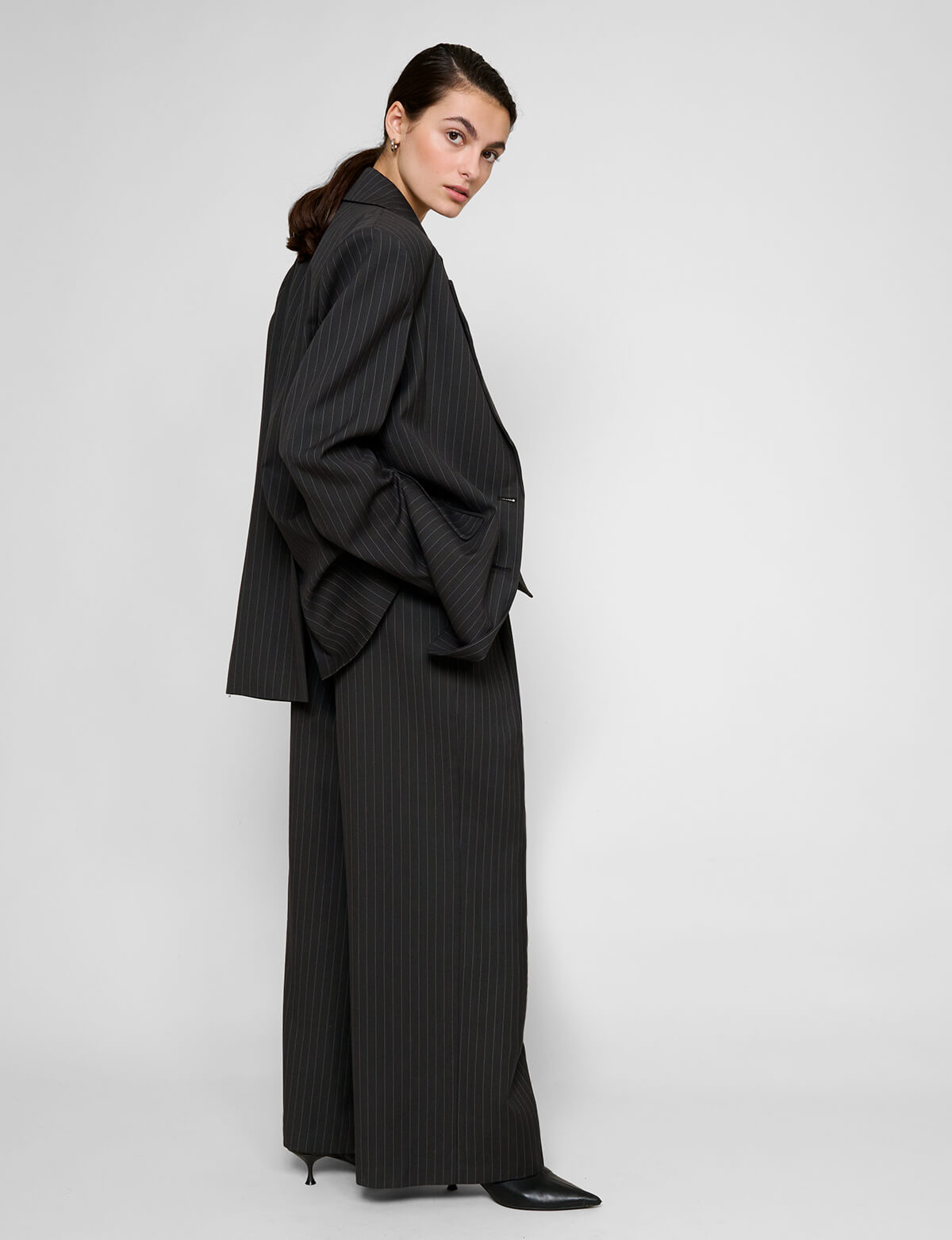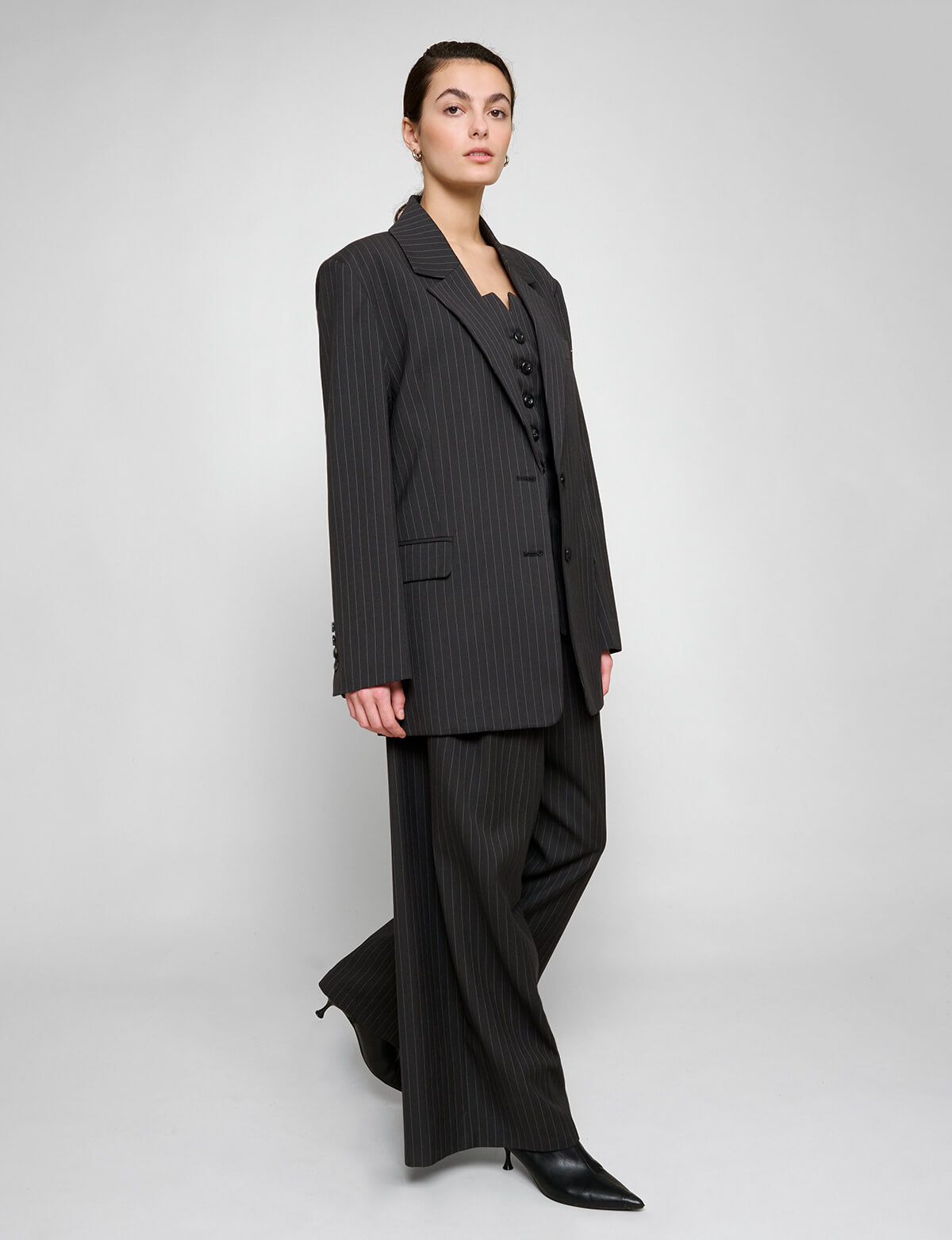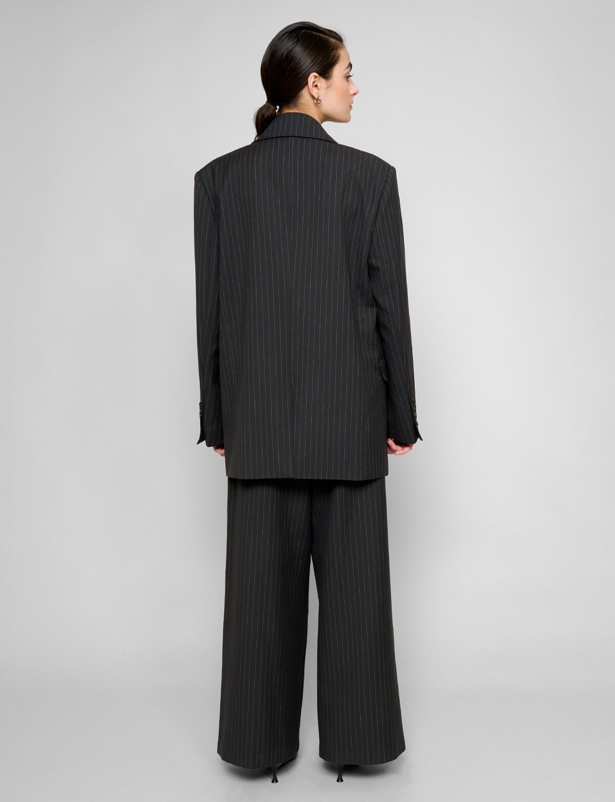 Chic dark grey oversized pinstripe blazer . Styles with matching Claude pants .