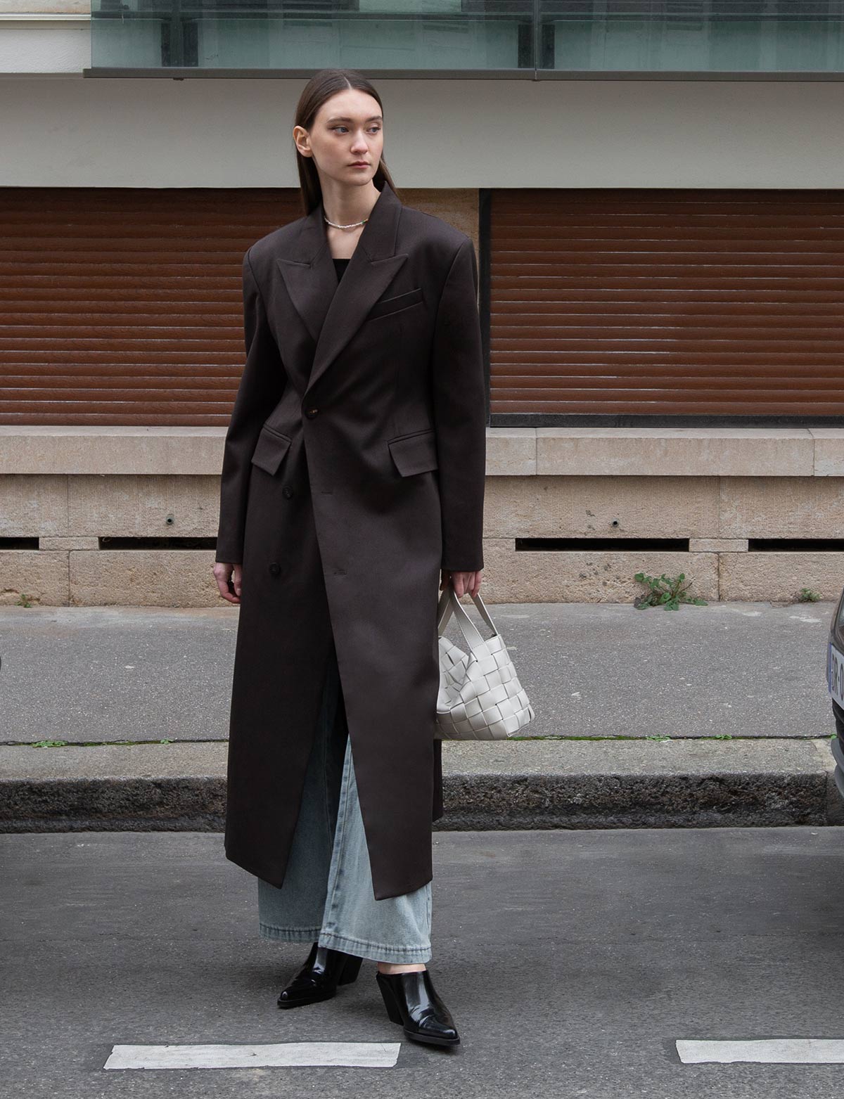 Chic dark brown hourglass cut floor length blazer coat with dropped padded shoulders