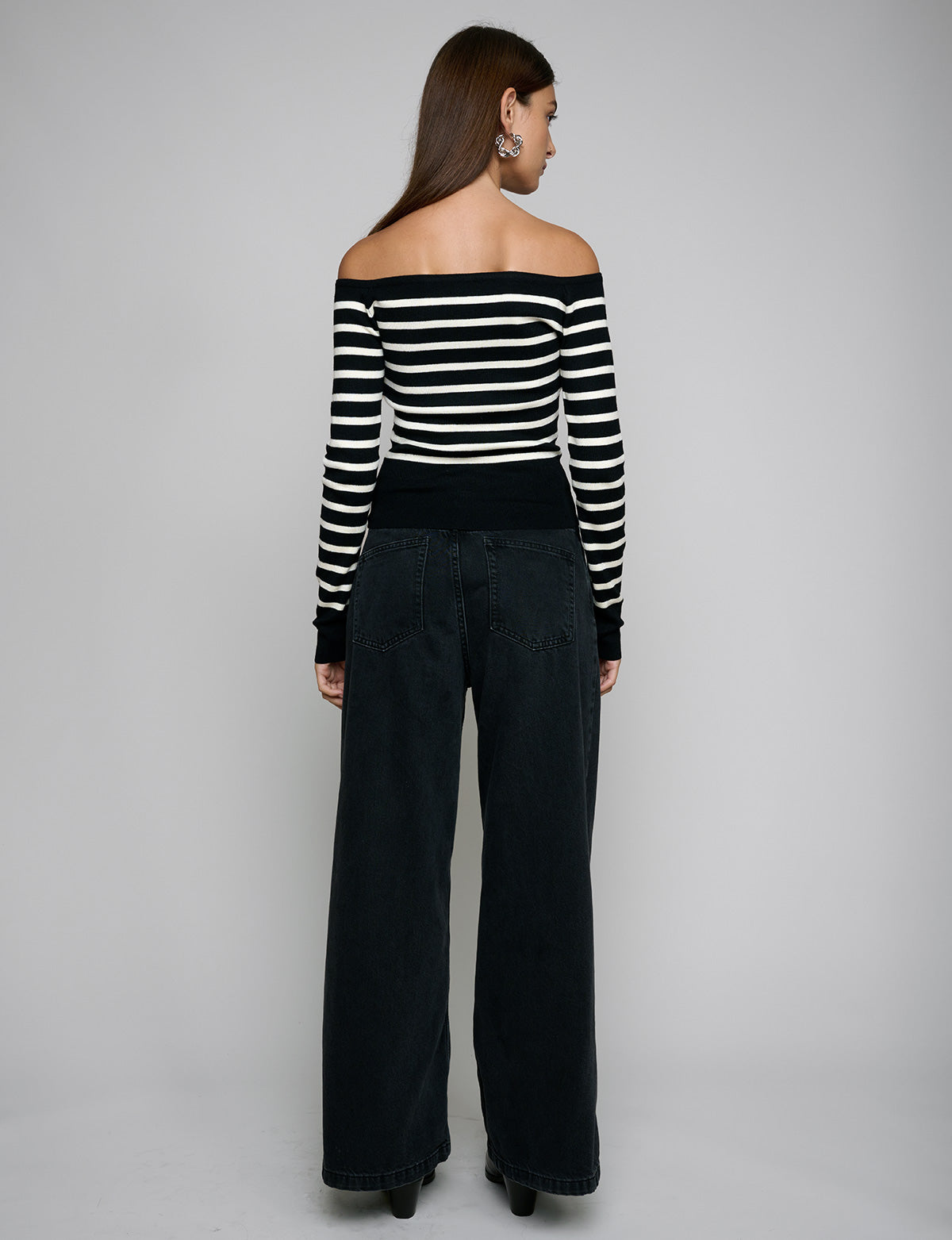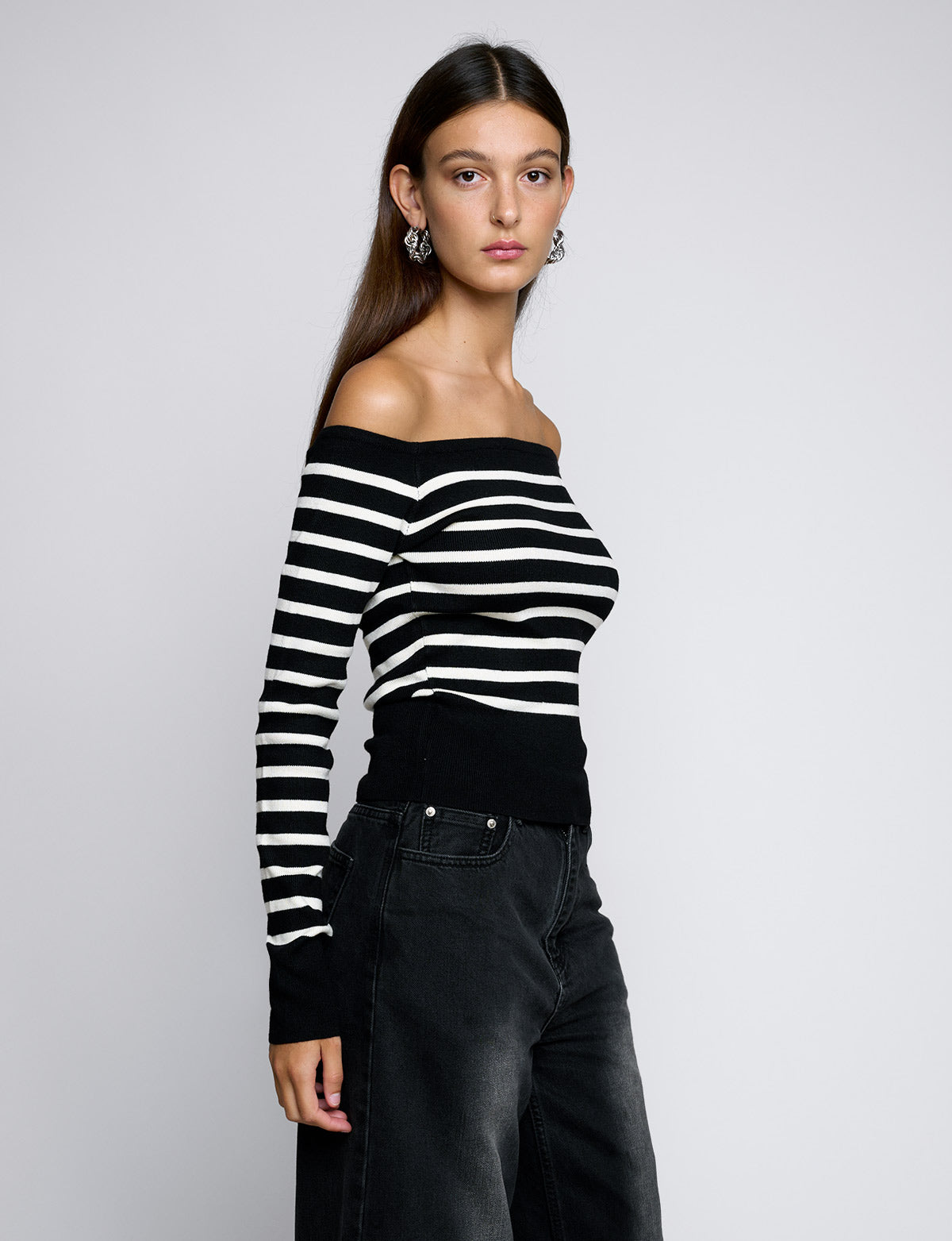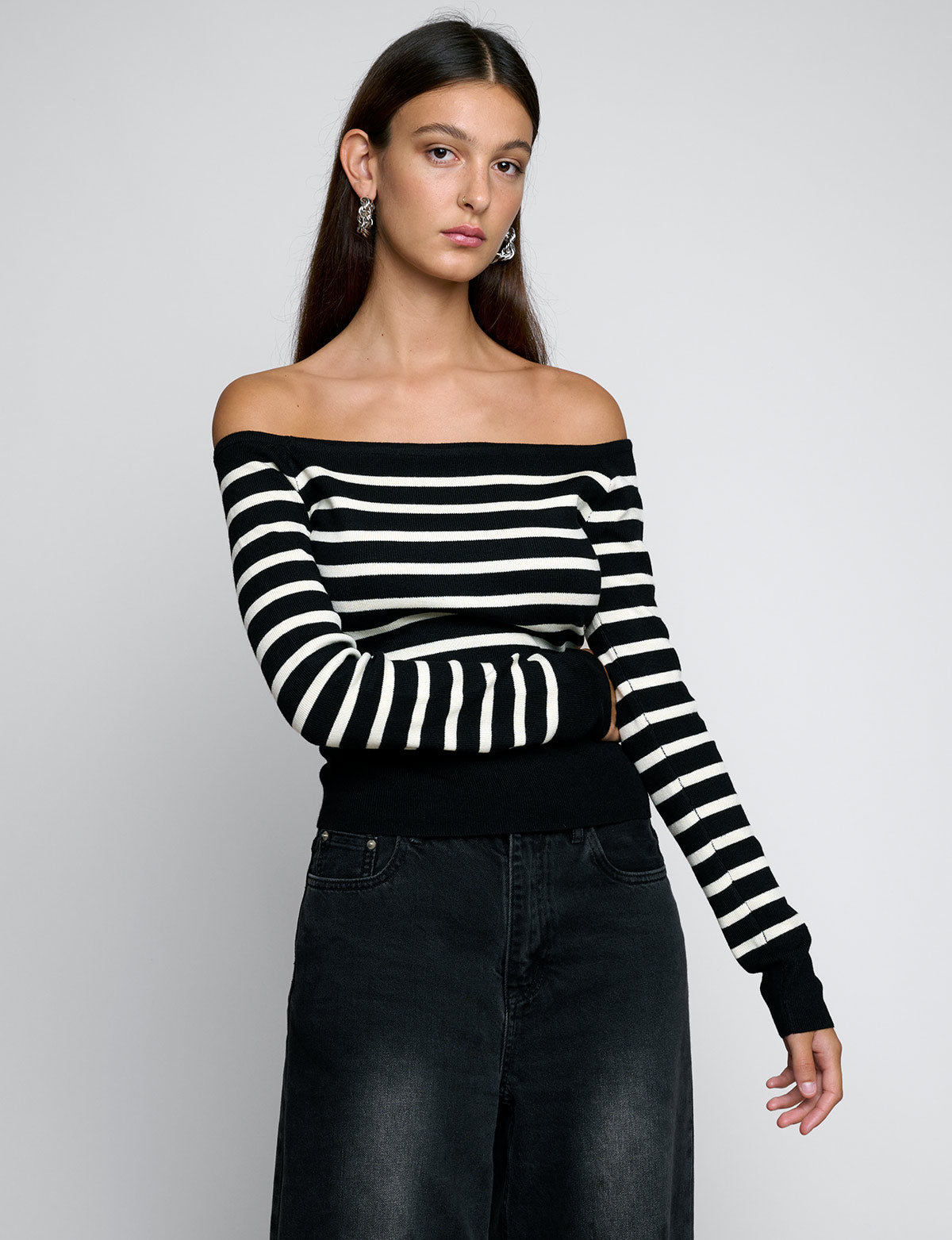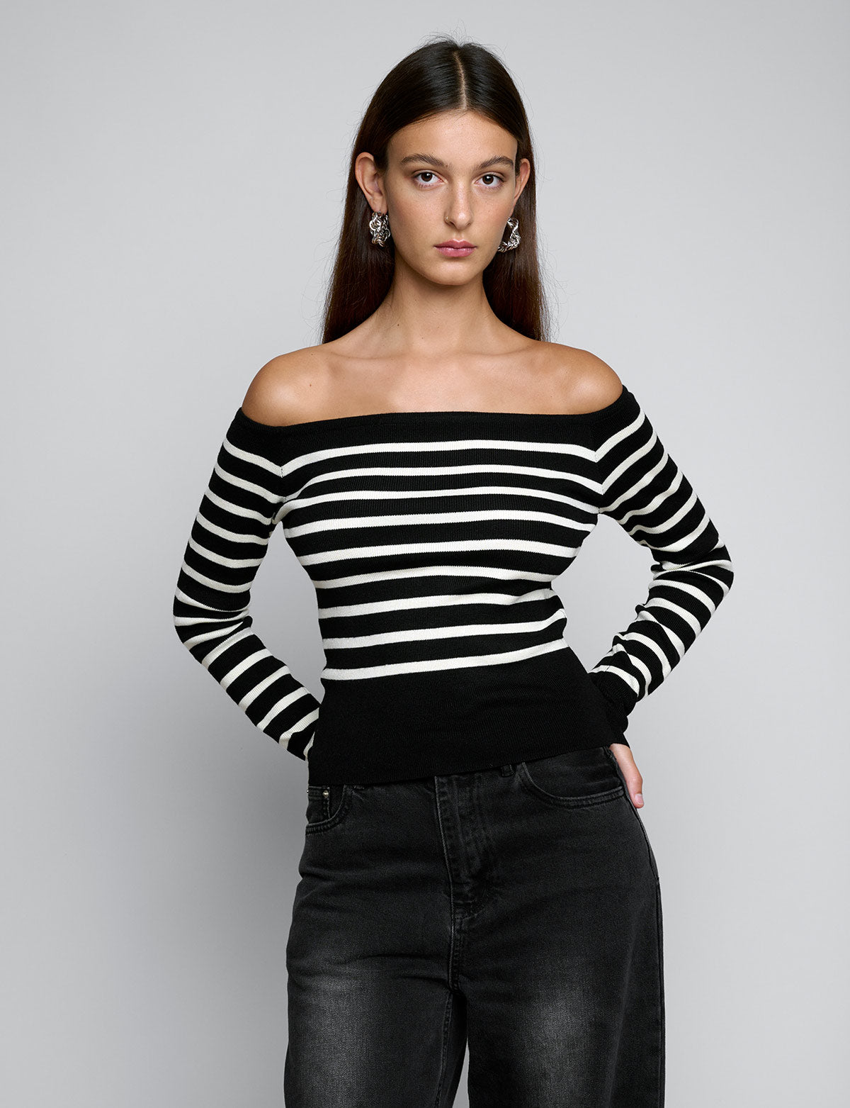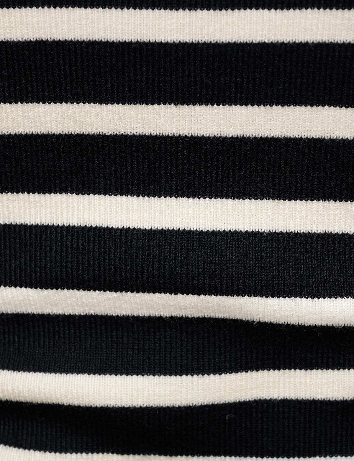 Chic and versatile black striped knit off the shoulder top.