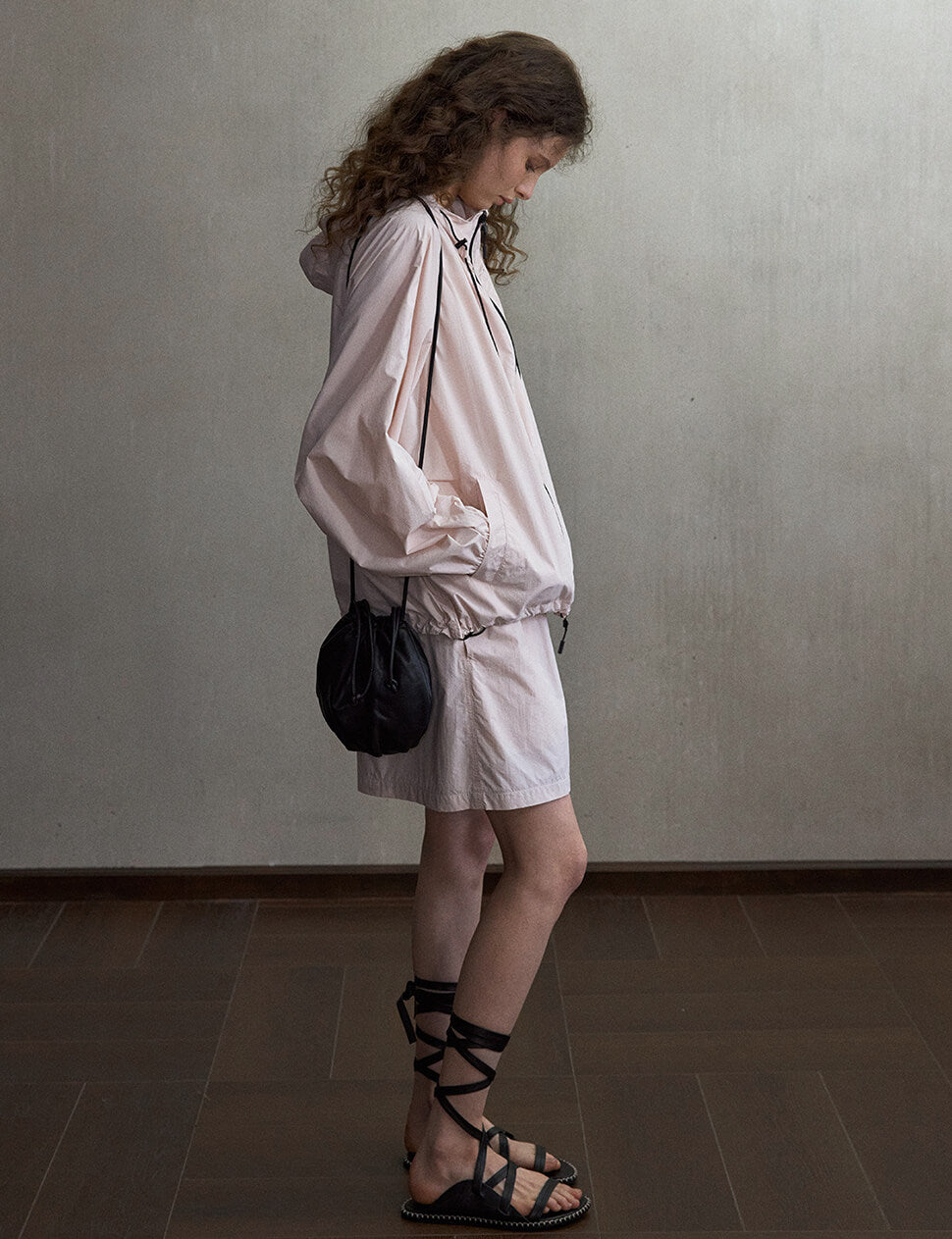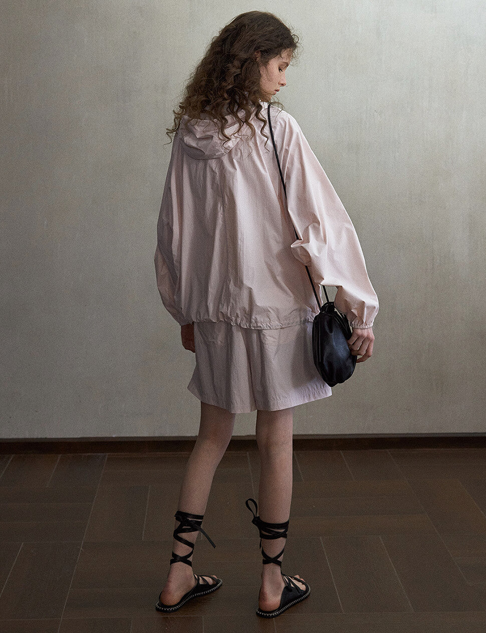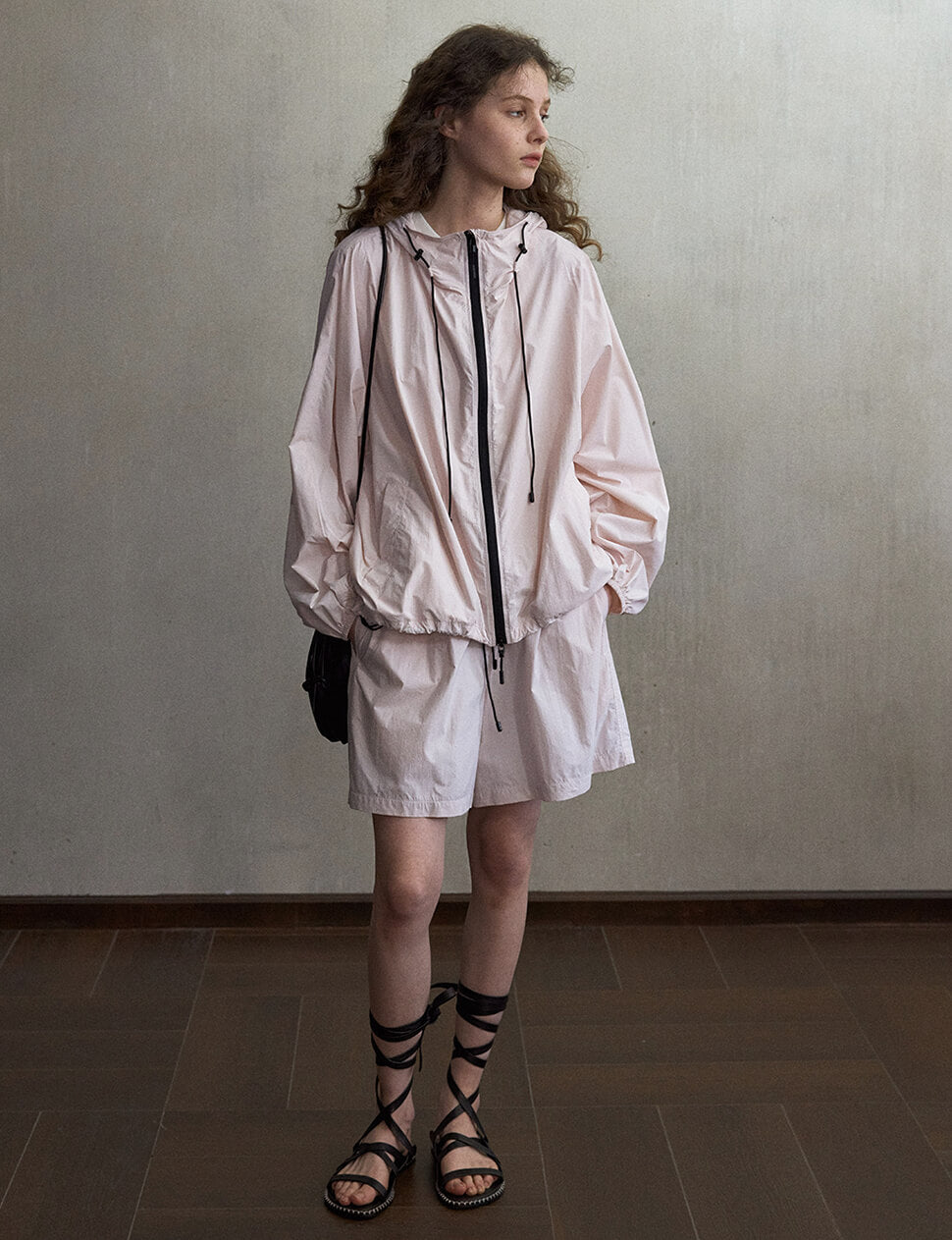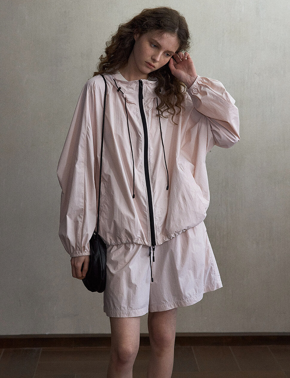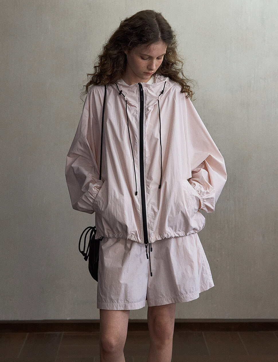 The jacket you throw on over everything and suddenly the whole outfit makes sense. Cut from a lightweight anti-UV nylon in an oversized, voluminous silhouette, the Parachute Windbreaker Jacket has that effortless, slightly sculptural shape that sits somewhere between outerwear and a statement piece. A zip-front closure, drawstring hood, and elasticated hem keep it functional without losing the ease. Wear it over the matching shorts or with straight-leg trousers and a simple tank .
