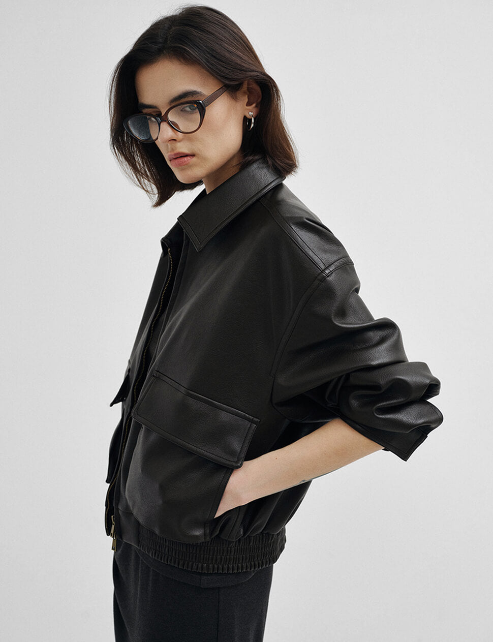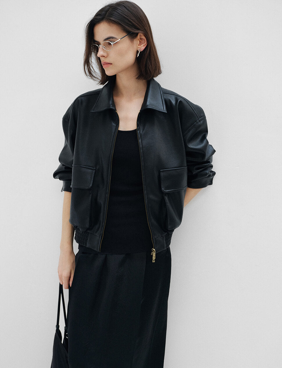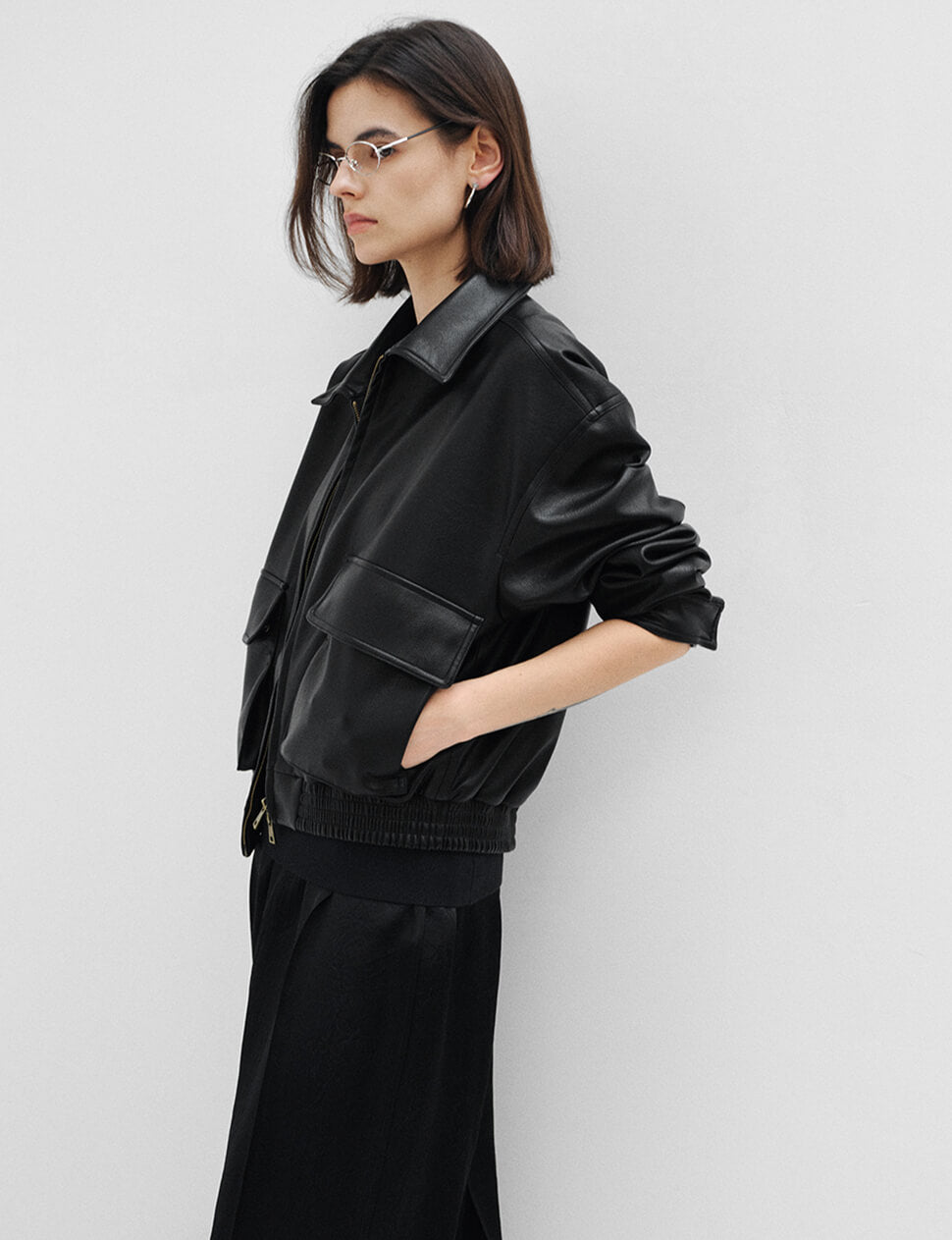The leather bomber, done right. This oversized faux leather cropped bomber jacket leads with the details that matter — two oversized cargo pockets at the chest, antique gold zip hardware, a spread collar, and a ribbed elastic hem that keeps the volume intentional. Cut with a relaxed, slightly boxy silhouette and finished with a full-length zip front, it works over everything from a slip skirt and tank to wide-leg trousers and a tee.