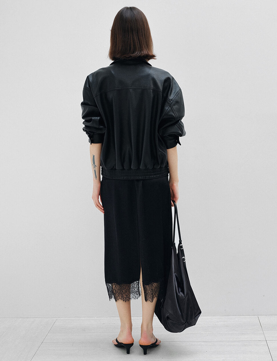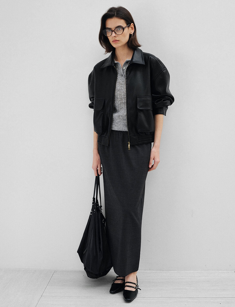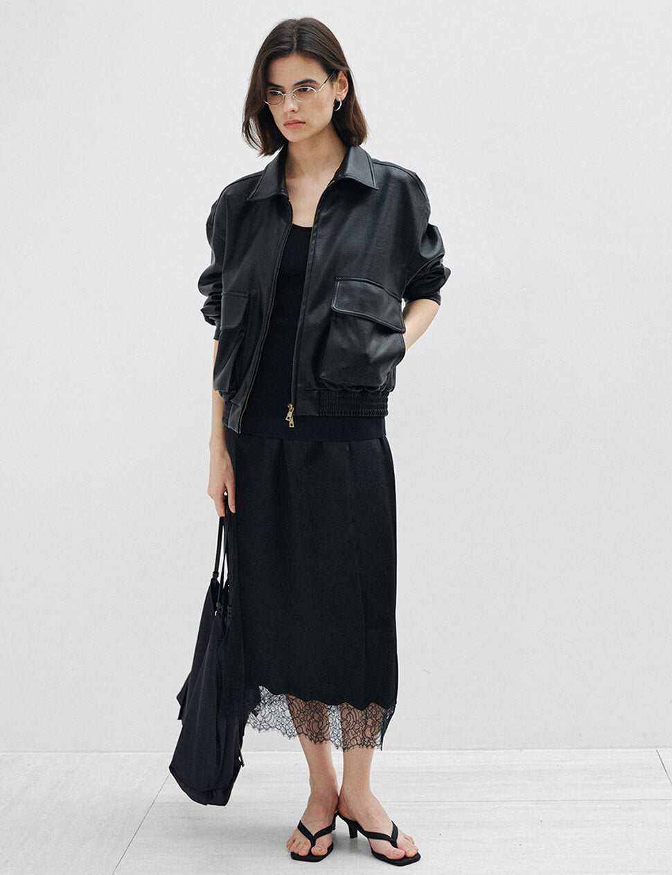 The leather bomber, done right. This oversized faux leather cropped bomber jacket leads with the details that matter — two oversized cargo pockets at the chest, antique gold zip hardware, a spread collar, and a ribbed elastic hem that keeps the volume intentional. Cut with a relaxed, slightly boxy silhouette and finished with a full-length zip front, it works over everything from a slip skirt and tank to wide-leg trousers and a tee.