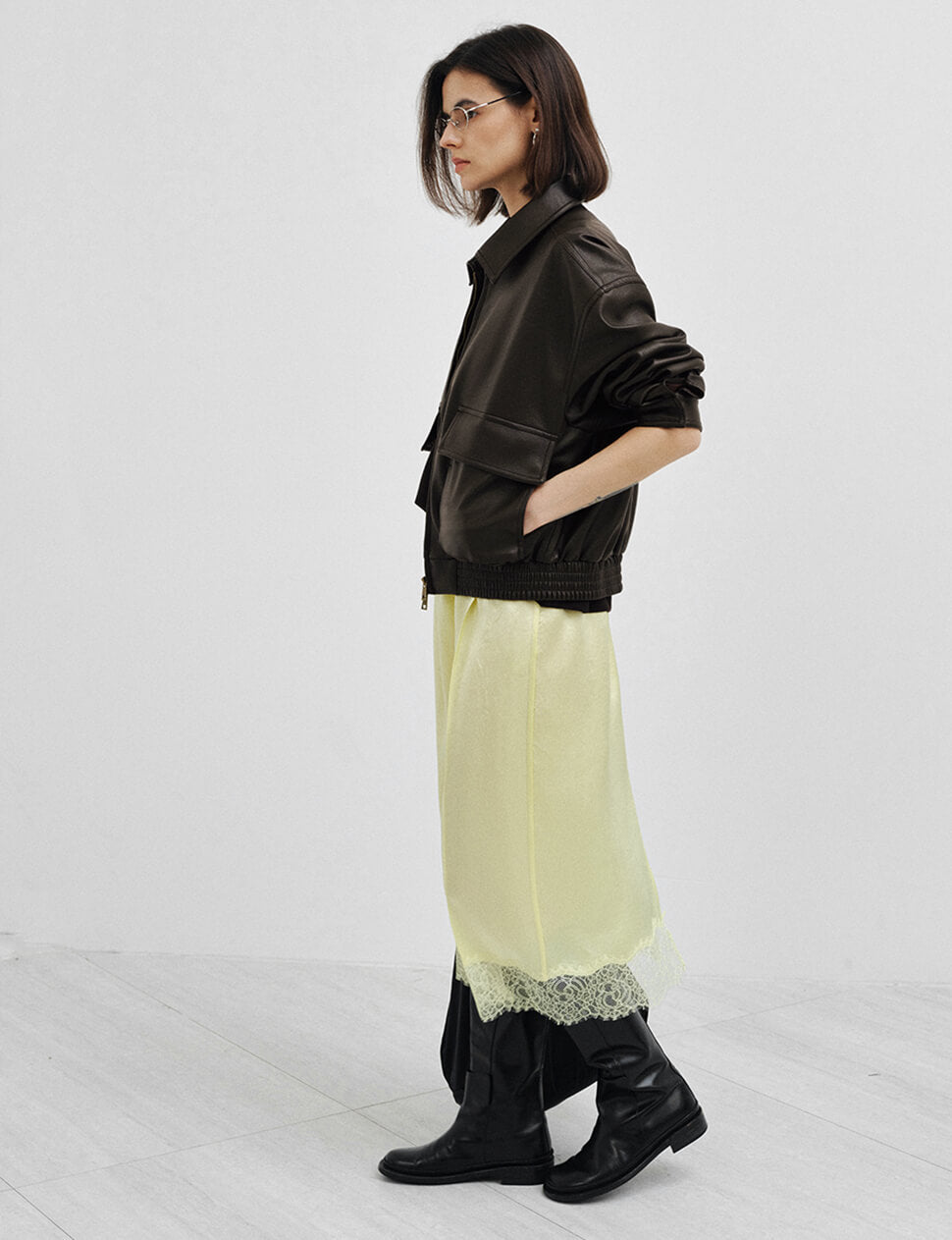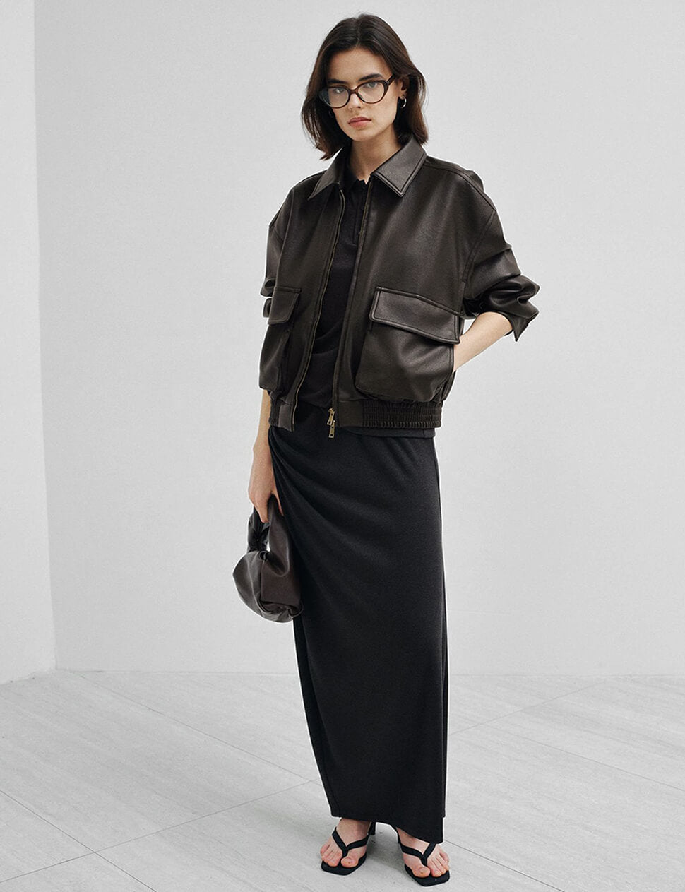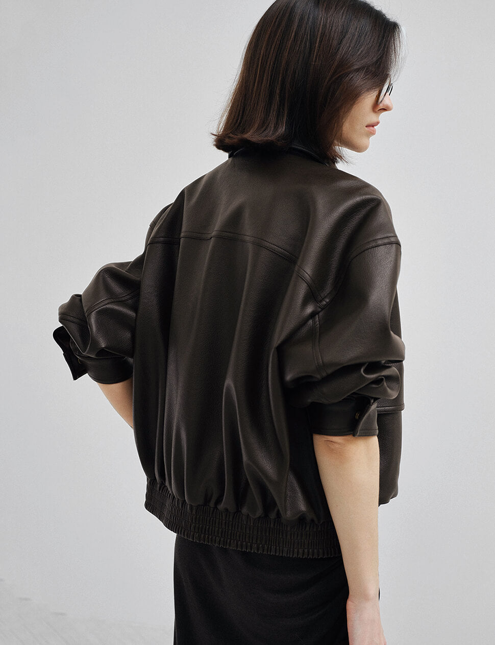 The dark brown leather bomber, done right. This oversized faux leather cropped bomber jacket leads with the details that matter — two oversized cargo pockets at the chest, antique gold zip hardware, a spread collar, and a ribbed elastic hem that keeps the volume intentional. Cut with a relaxed, slightly boxy silhouette and finished with a full-length zip front, it works over everything from a slip skirt and tank to wide-leg trousers and a tee.