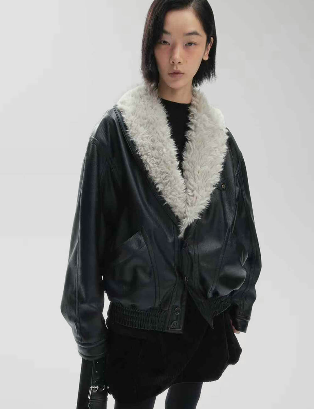 Black leather vintage-style leather with faux fur collar .