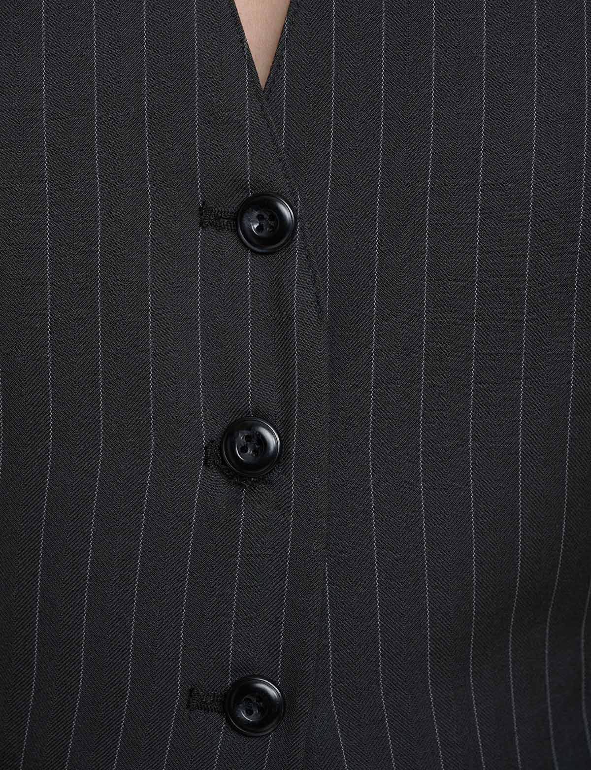 Halter pinstripe button vest with fitted waist darts. Styled with matching pinstripe trousers.