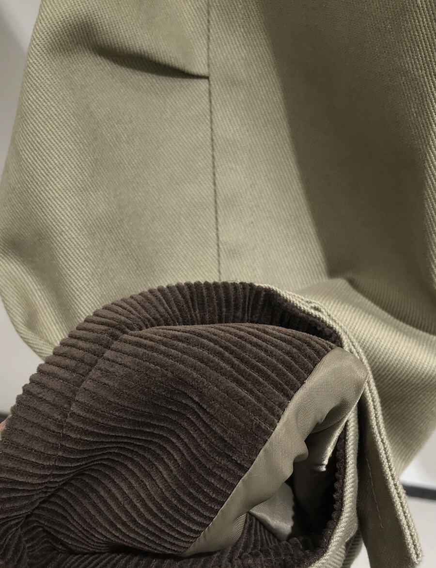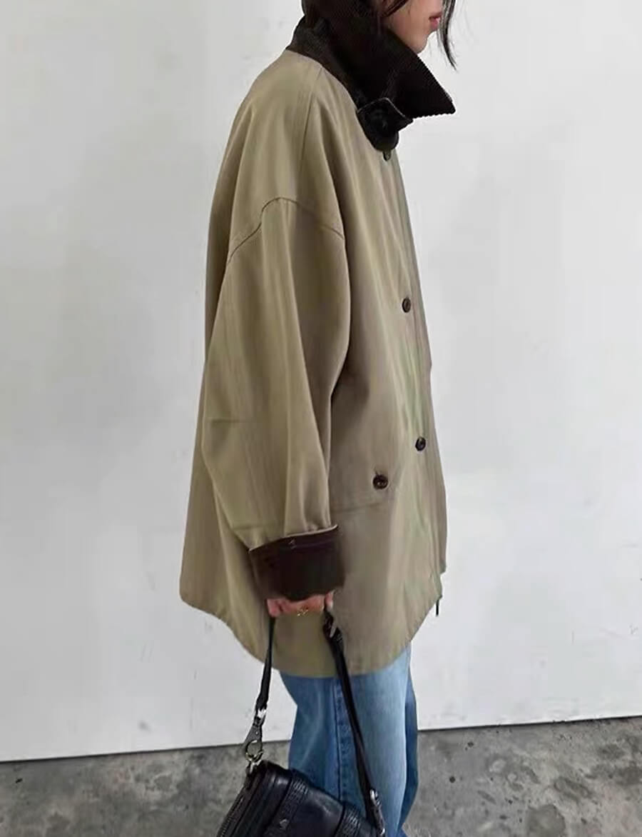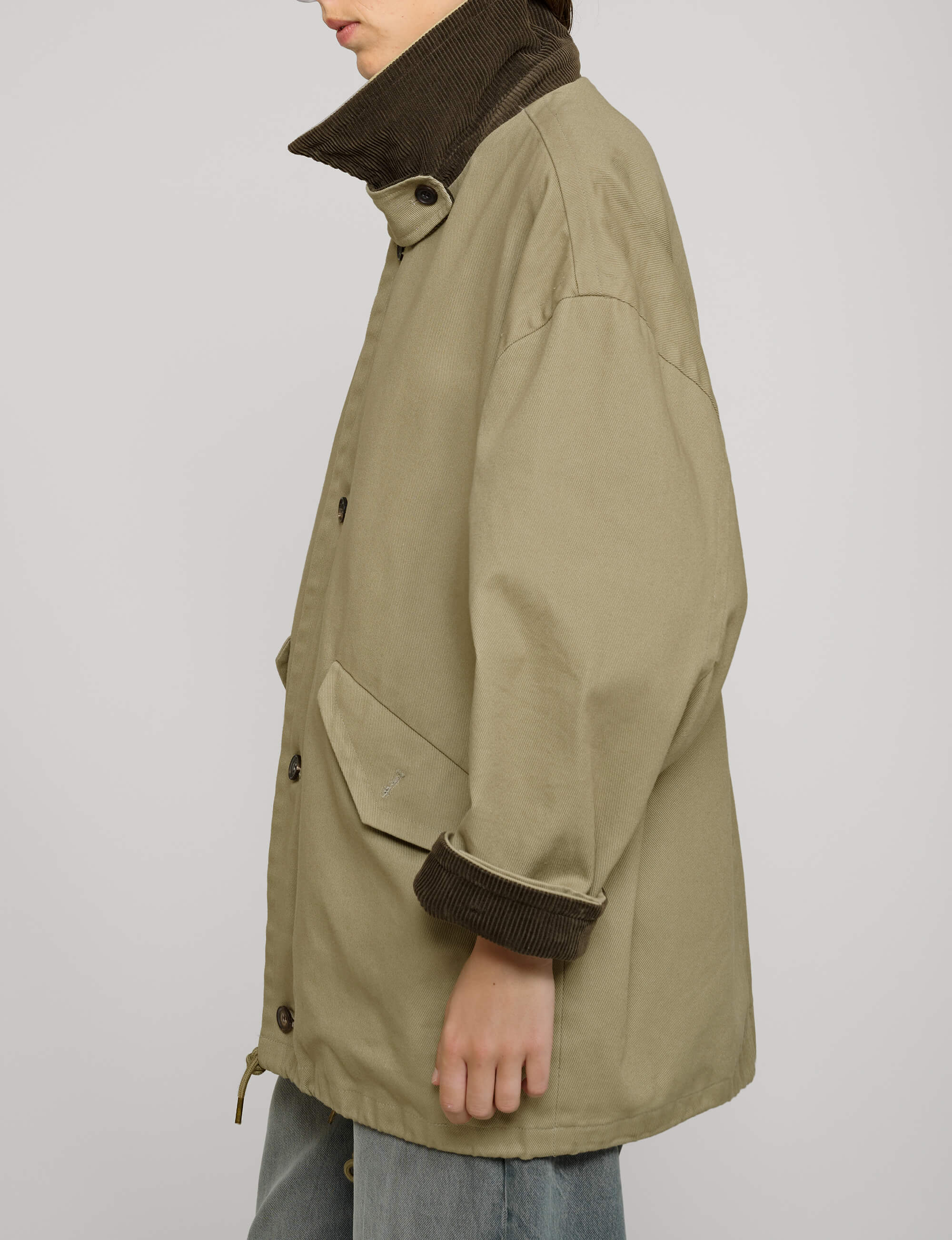 Khaki oversized country jacket with brown corduroy contrast collar and sleeve cuff .