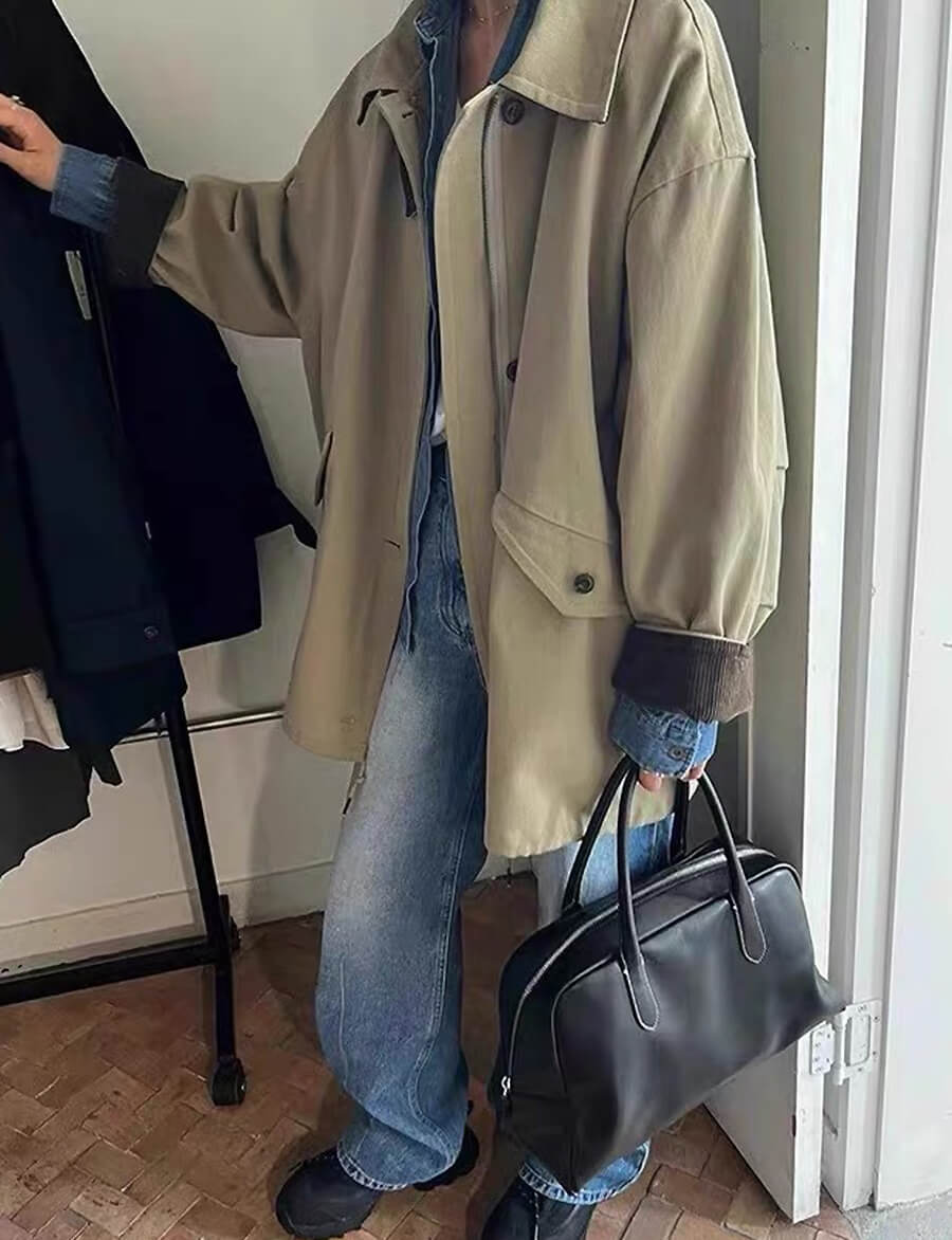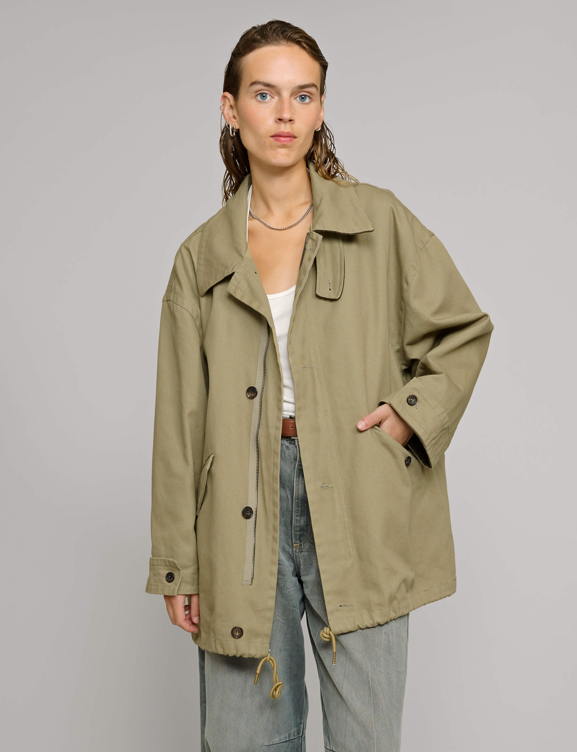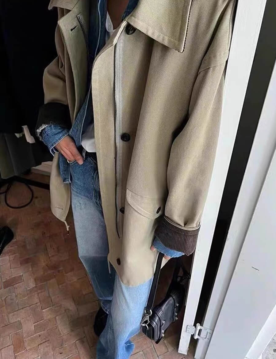 Khaki oversized country jacket with brown corduroy contrast collar and sleeve cuff .