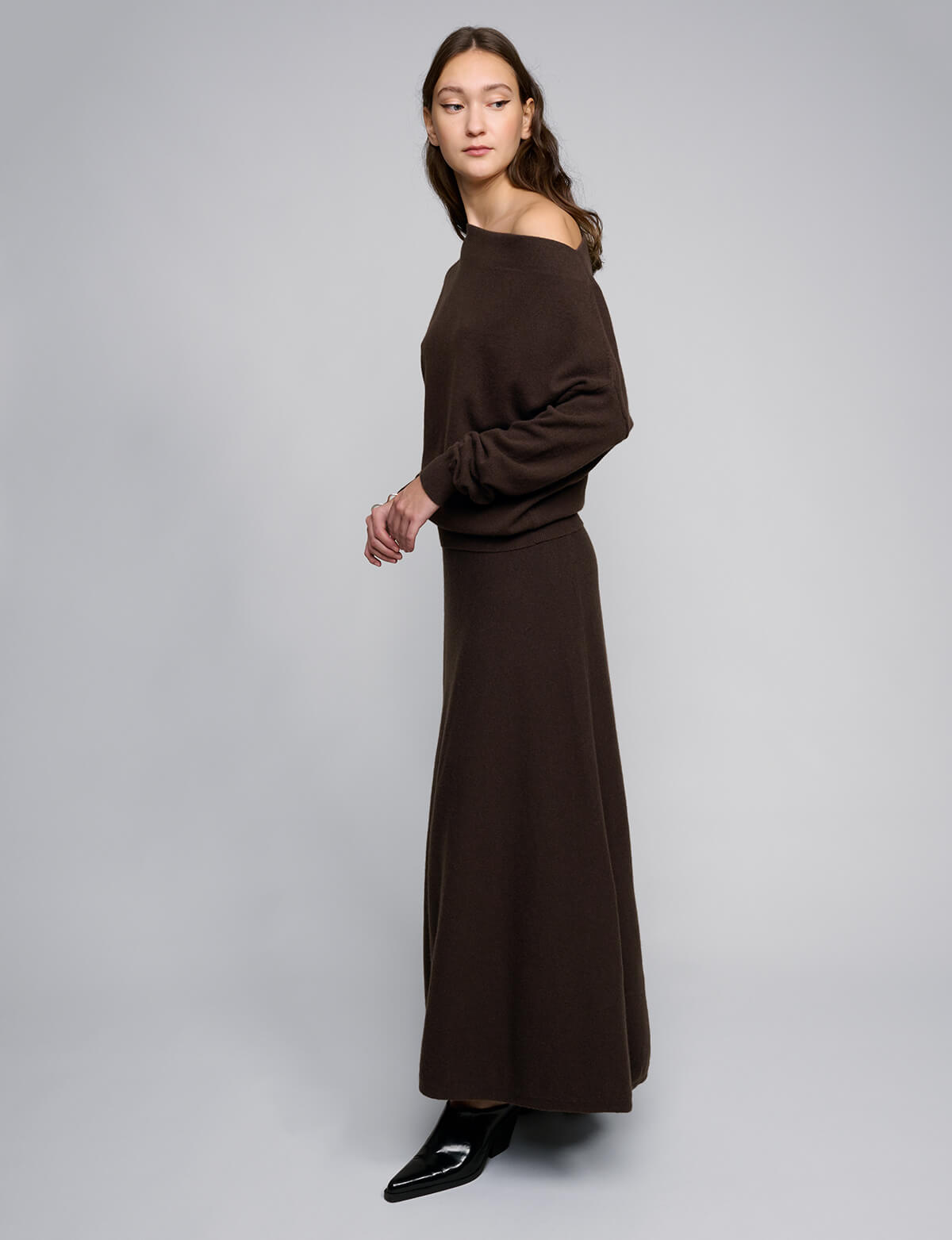 Chocolate brown maxi full skirt with elastic waistband . Styled with matching off-the-shoulder knit top.