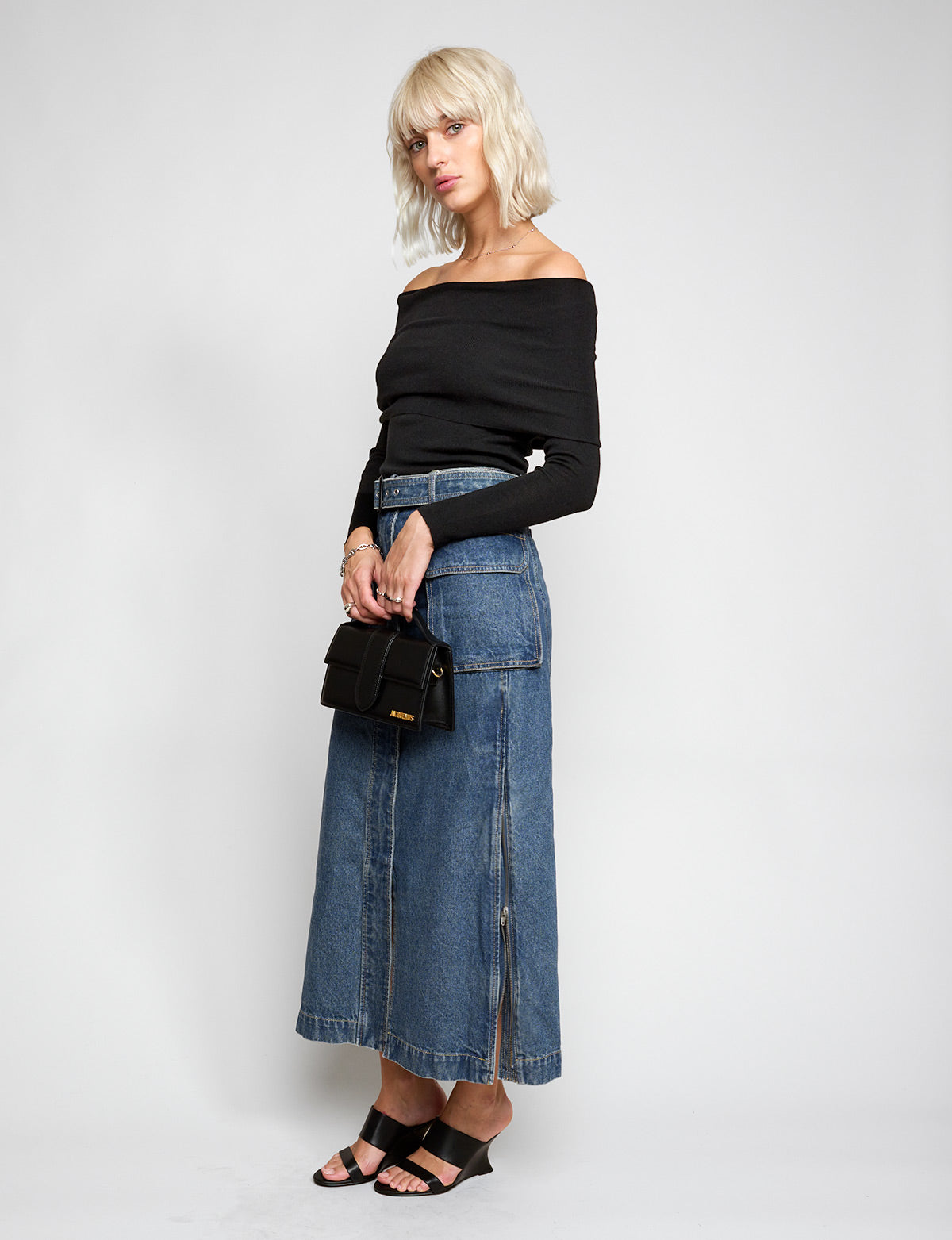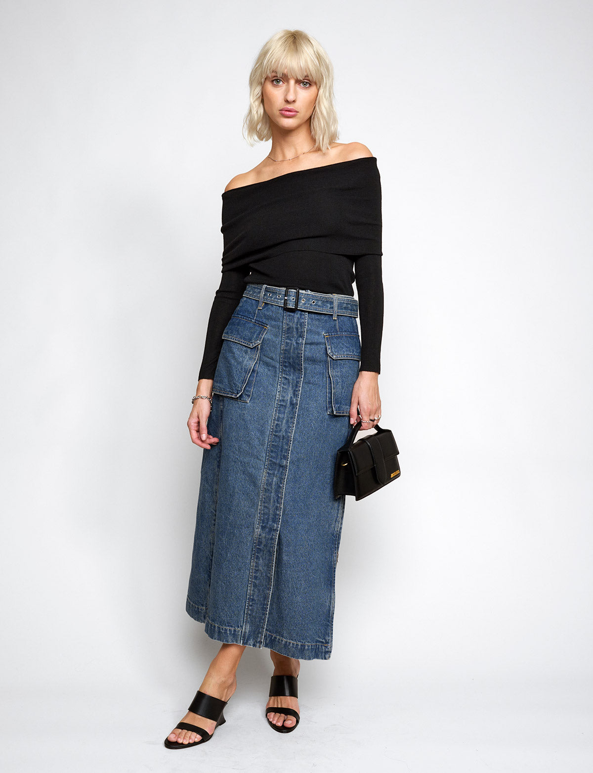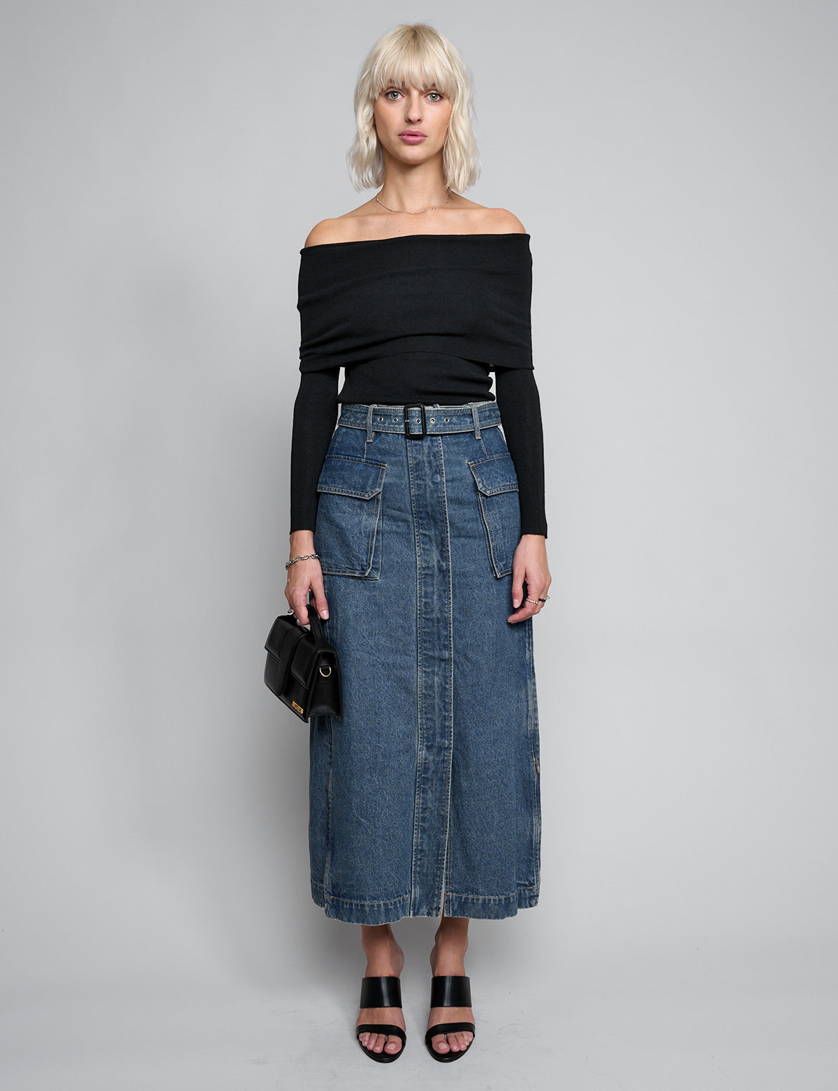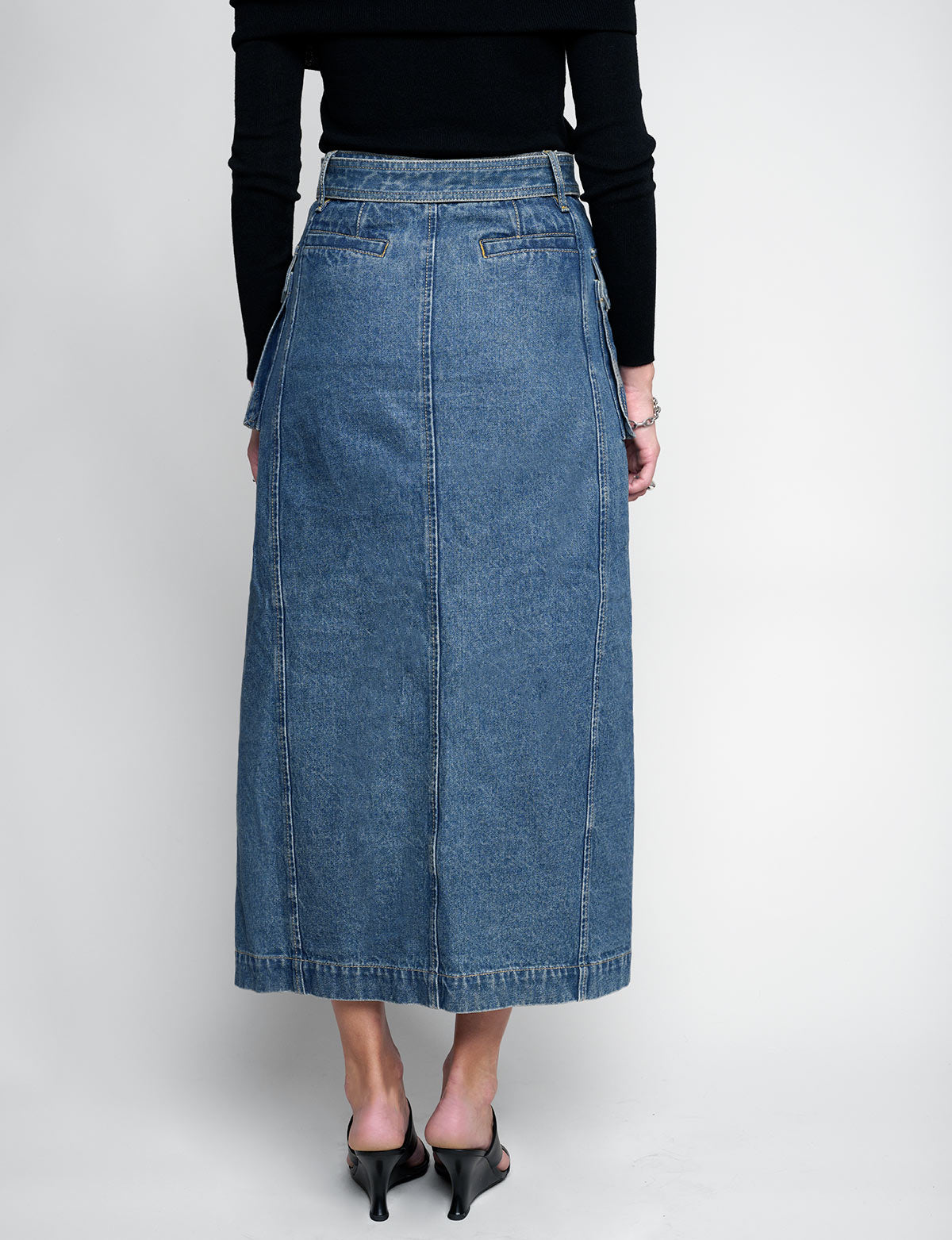 Long denim belted skirt with cargo patch pockets and side zip opening.