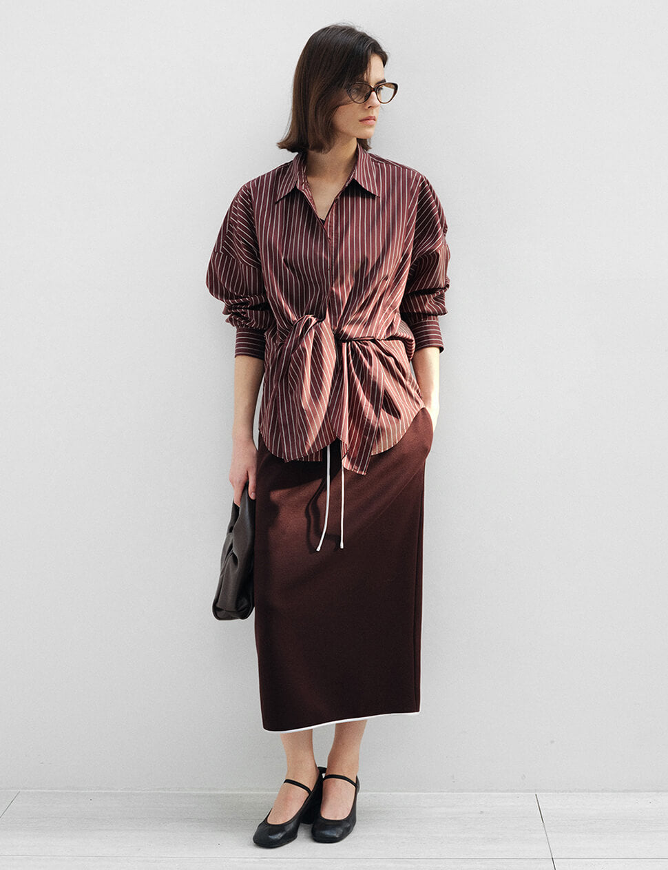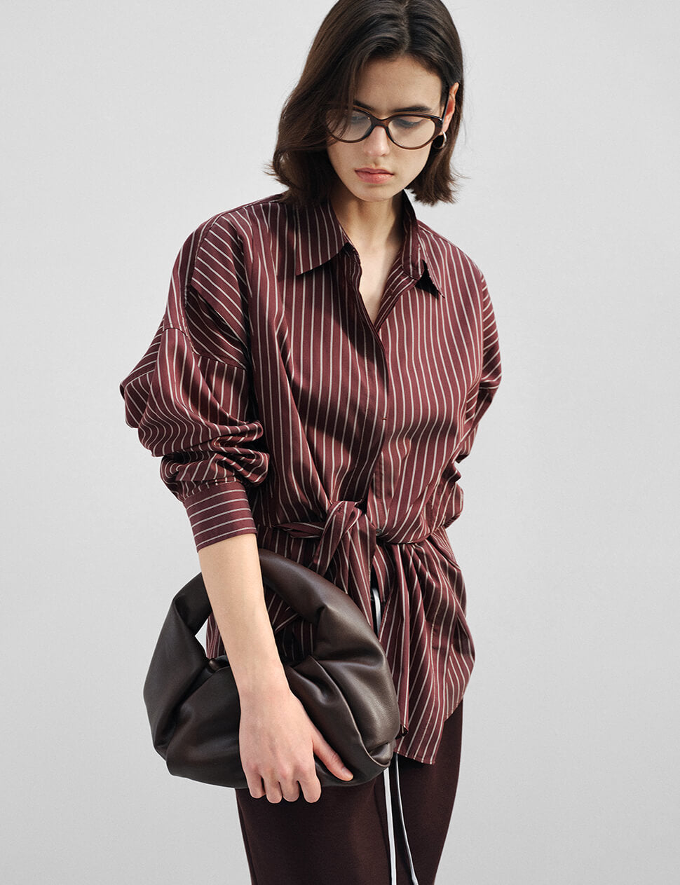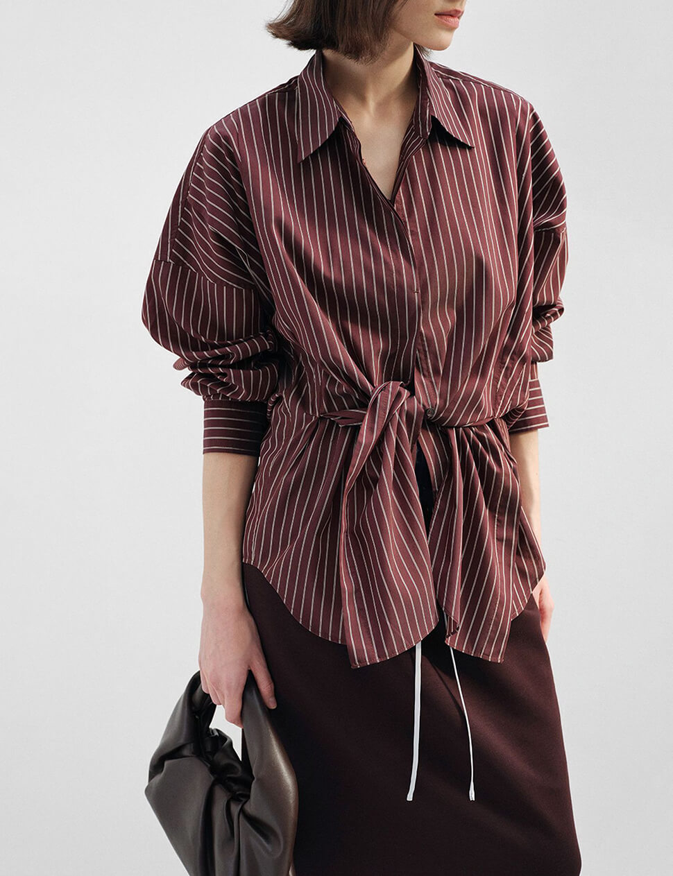 The striped shirt that does two things well. Wear it loose over wide-leg trousers for an effortless longline look, or tie it at the waist and let the volume work differently — structured where it needs to be, relaxed everywhere else. Cut in an oversized silhouette from soft lyocell, it has the kind of drape that photographs like silk but feels like nothing.